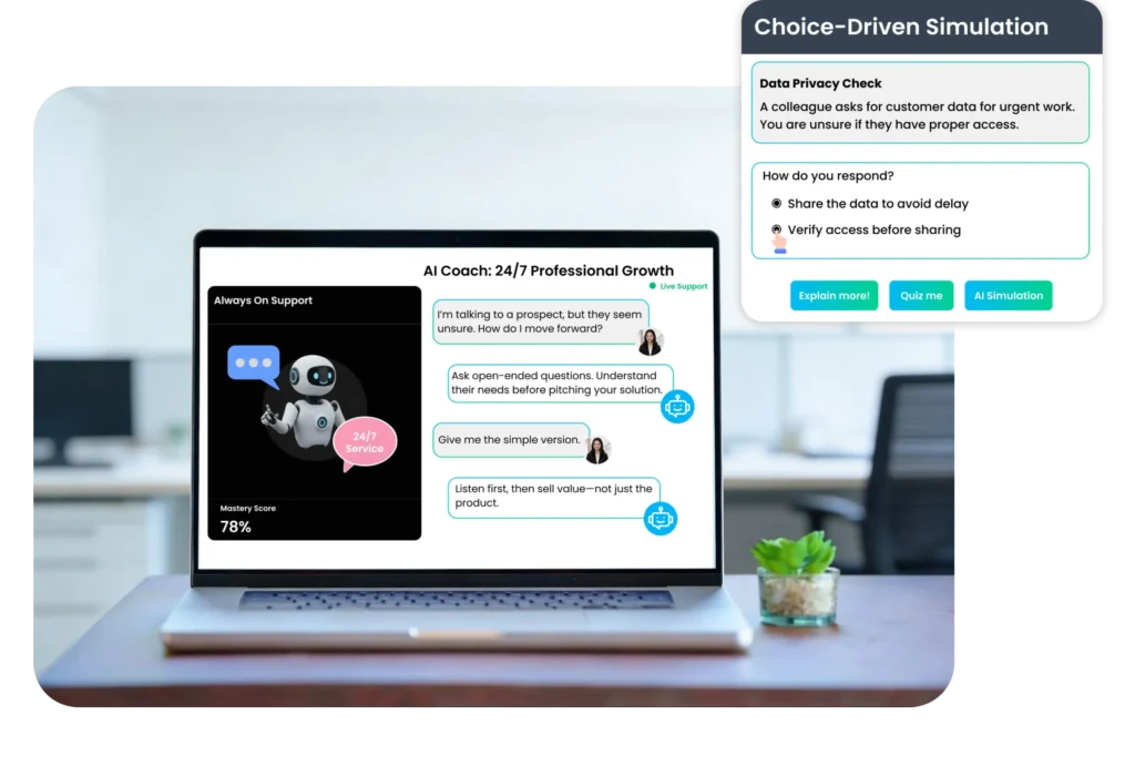 When employees get stuck, guidance is instant, ensuring uninterrupted learning through AI coaching.