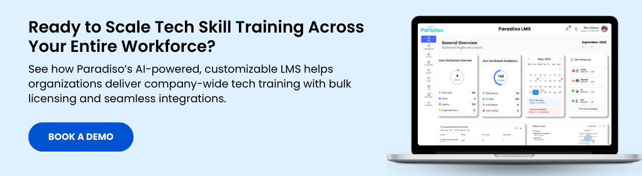 Ready to get started with Paradiso LMS and elevate your company’s tech training programs? Request a demo today to explore how Paradiso can help you upskill your workforce efficiently and effectively.