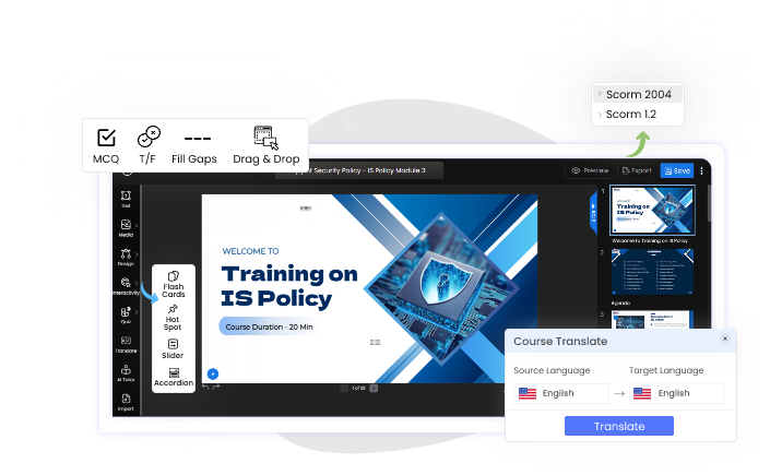 Worried about technical compatibility and reaching your learners everywhere? Relax. Our free eLearning authoring tool powered by AI takes the stress out of publishing. Ensure your course works perfectly on any platform with guaranteed SCORM compliance, so you can focus on teaching, not tech.