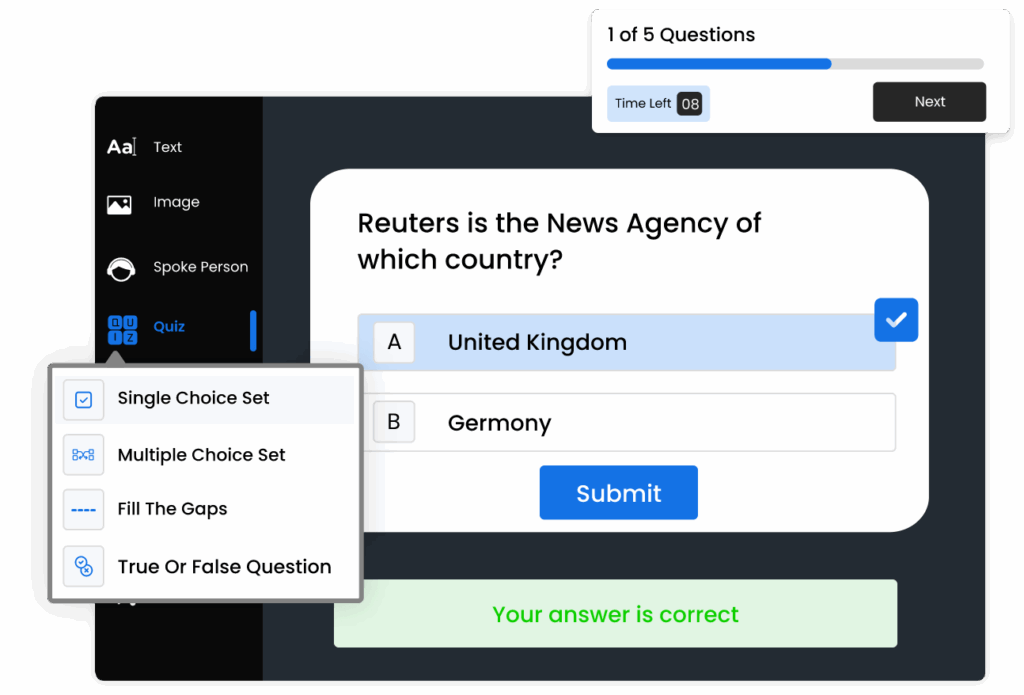 - Build Course from Scratch – Use the drag-and-drop editor to design courses your way. Add text, images, videos, and interactions for a fully immersive experience.